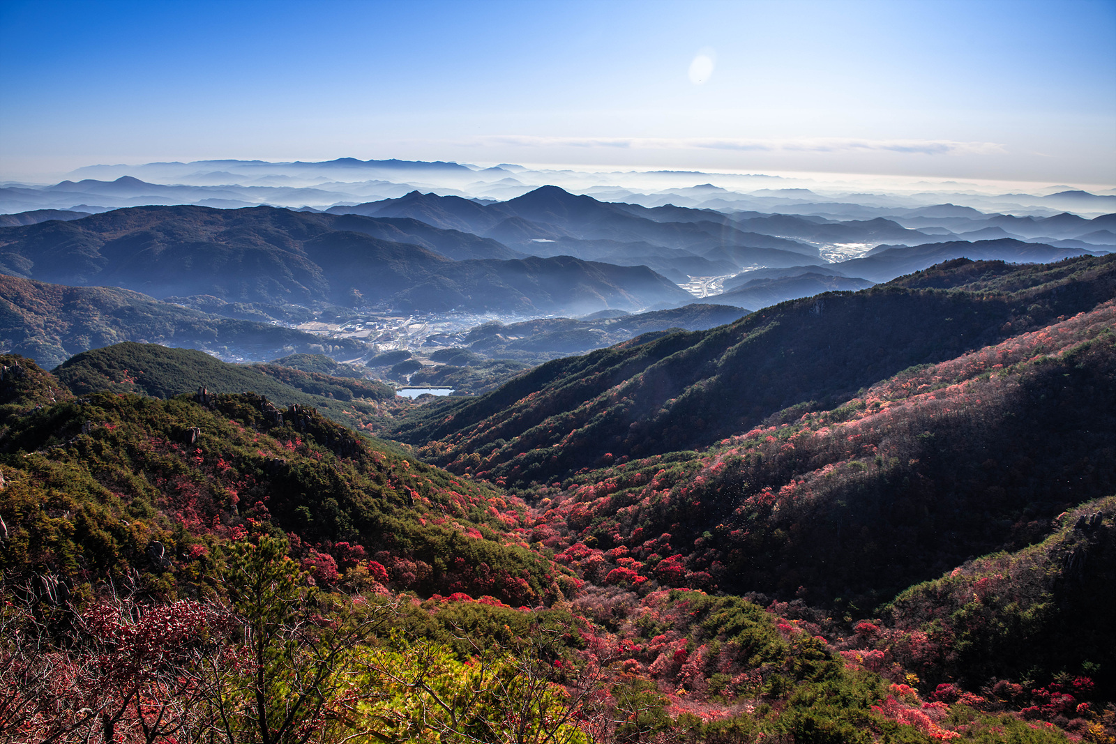붉게 물든 나뭇잎과 붉게 떠오르는 일출빛이